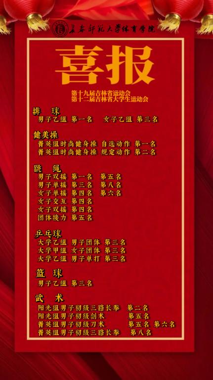 连日来,吉林省第十九届运动会暨吉林省第十二届大学生运动会各项比赛正在紧张有序的进行,截至目前,我校代表队已获得男子排球(菁英组)冠军,女子排球(菁英组)季军,乒乓球男子单打(阳光组)季军,男子篮球(菁英组)季军,健美操(菁英组)冠、亚军,男子武术(阳光组)亚军,男子花式跳绳(菁英组)冠军、季军,羽毛球男子单打(菁英组)亚军。