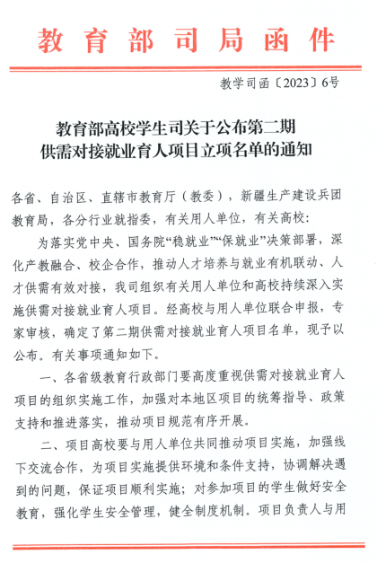 近日,教育部公布《教育部高校学生司关于公布第二期供需对接就业育人项目立项名单的通知》,我校工程学院就业实习基地项目等4个项目获批立项。