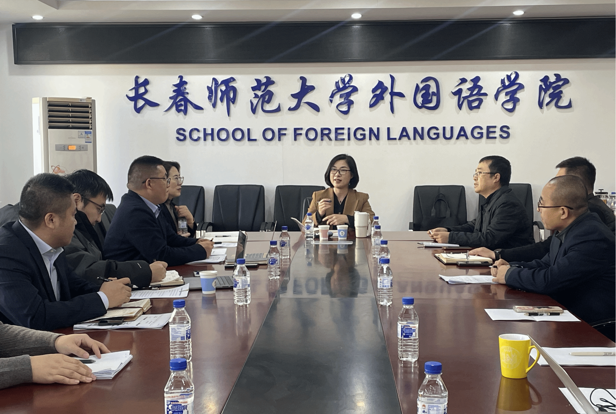 外国语学院党总支书记李晓飞、院长苗宁分别就学院党建与思想政治工作、学院发展概况、教学科研、特色工作、国际交流和未来规划等工作进行汇报。