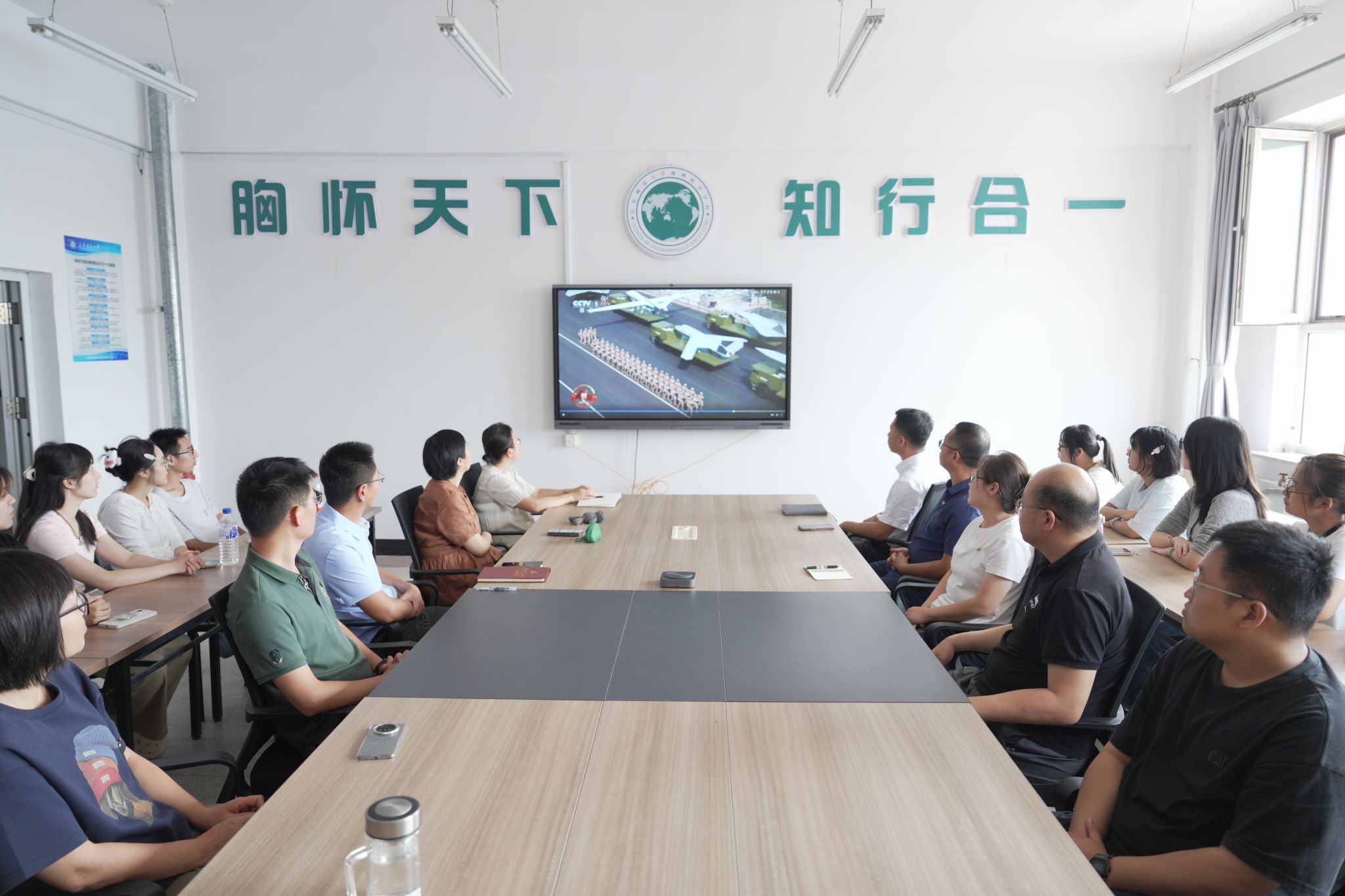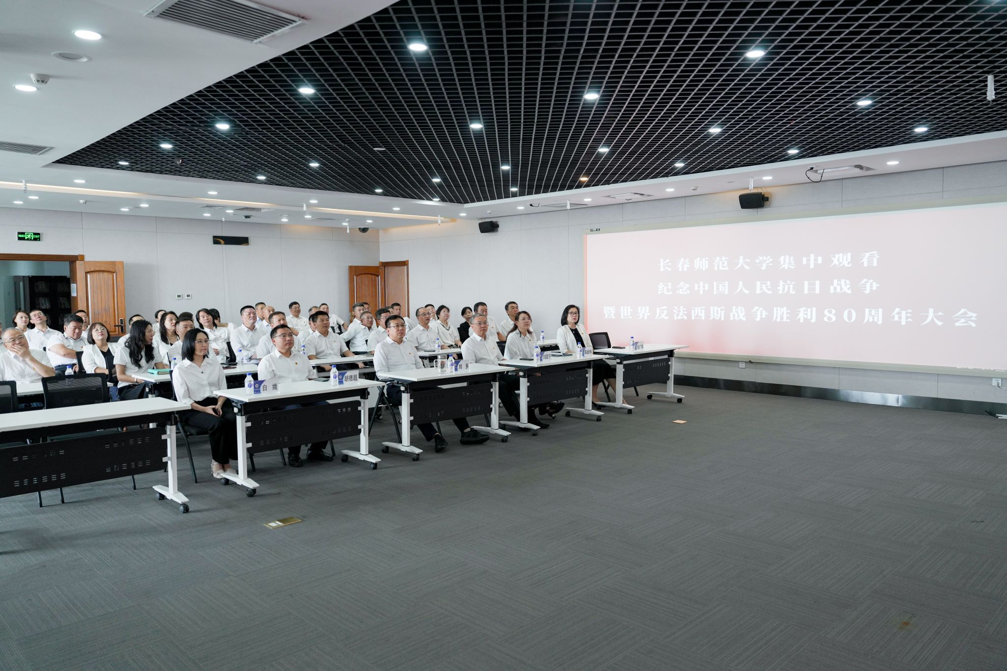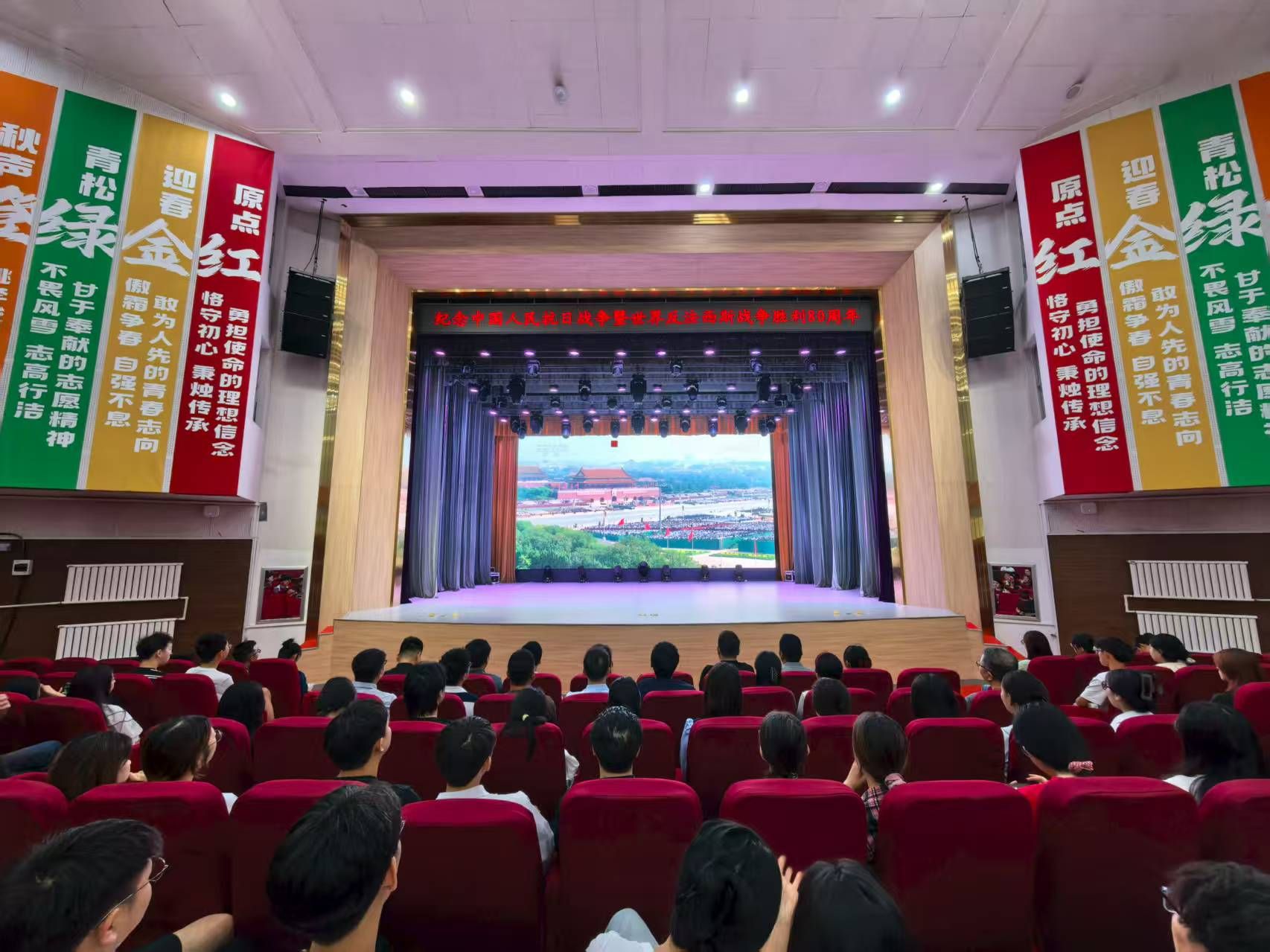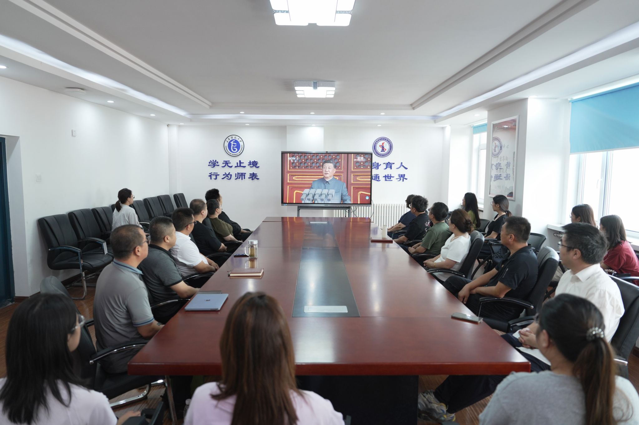 三军列阵,铁甲生辉;战鹰呼啸,壮志凌云。9月3日上午9时,纪念中国人民抗日战争暨世界反法西斯战争胜利80周年大会在北京天安门广场隆重举行。中共中央总书记、国家主席、中央军委主席习近平发表重要讲话。学校领导、两委委员、各职能部门负责人在教学综合楼1101会议室集中观看庆祝大会及阅兵式现场直播;学生工作部、团委组织学生代表在长师会堂集中观看;各学院组织师生员工采取线上线下相结合的方式,第一时间观看大会直播的盛况。